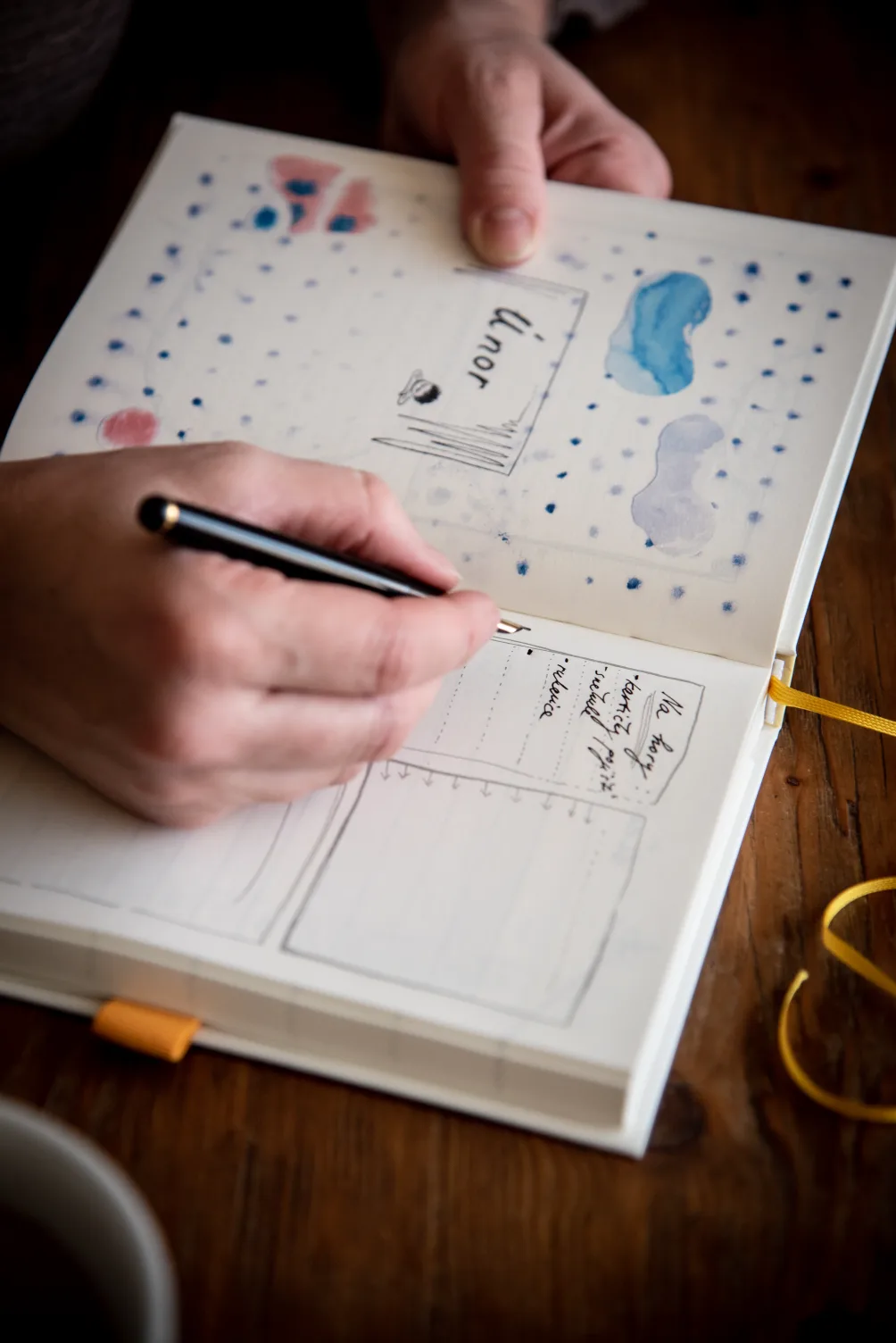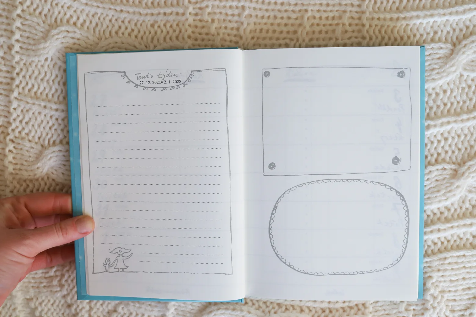 V čem je náš diář unikátní? Dělali jsme ho na míru rodičům – na každý týden máte tedy hned dvě dvoustrany. Na první dvoustraně je týdenní kalendář s prostorem pro mne a sloupečky pro rodinu. Na druhé dvoustraně si můžete obecně pro tento týden zapsat události a úkoly bez daného data.