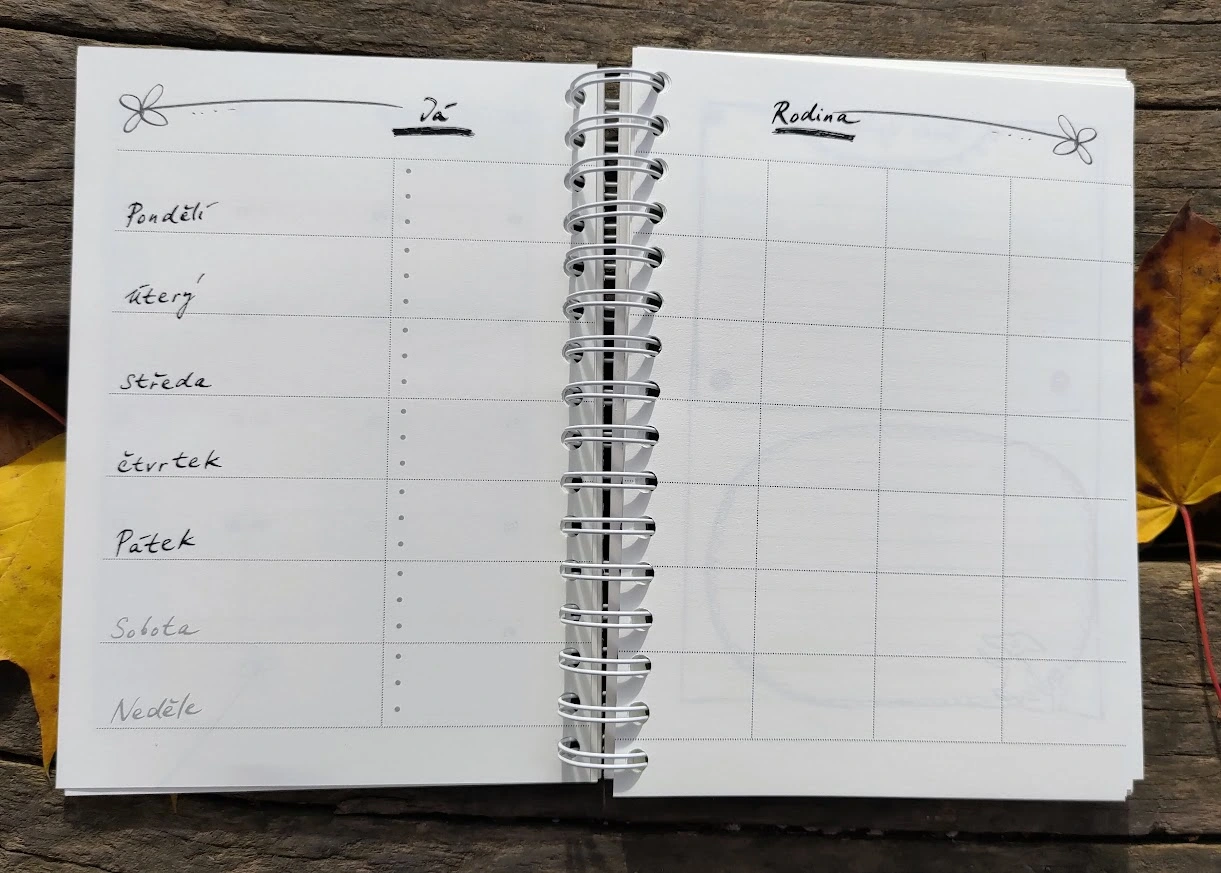 V čem je náš diář unikátní? Dělali jsme ho na míru rodičům – na každý týden máte tedy hned dvě dvoustrany. Na první dvoustraně je týdenní kalendář s prostorem pro mne a sloupečky pro rodinu. Na druhé dvoustraně si můžete obecně pro tento týden zapsat události a úkoly bez daného data.
