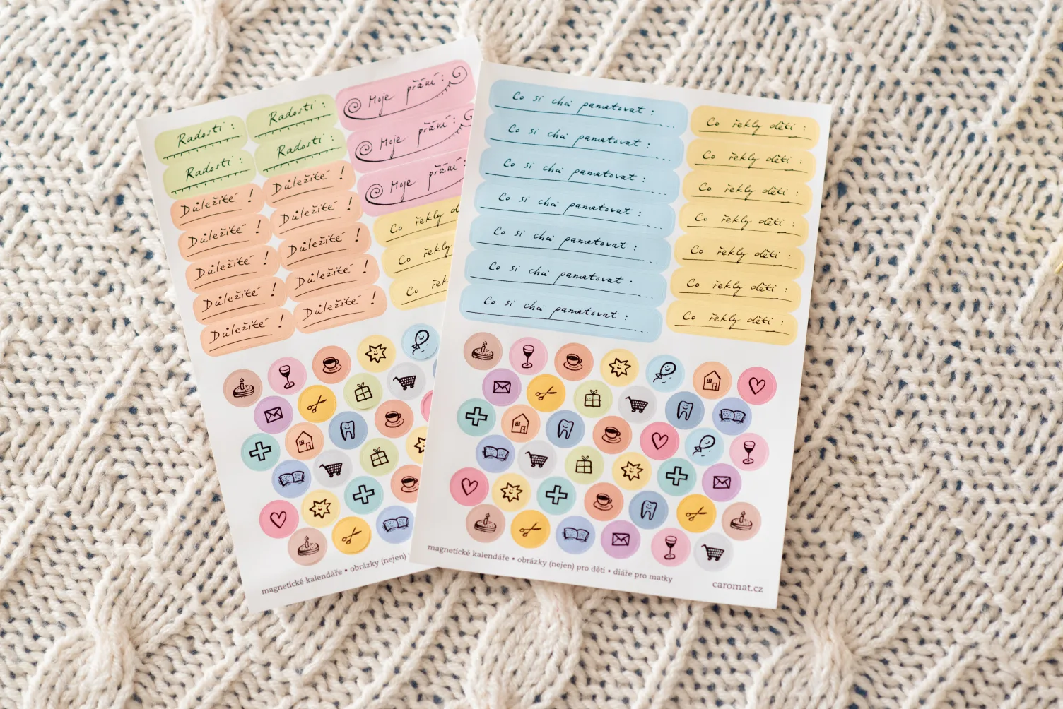 Větší samolepky obsahují nápisy, které se vám hodí do bublin v diáři: „Důležité“, „Co si chci pamatovat“, „Co řekly děti“ a další. Rozměry samolepek s nápisy jsou upravené přímo pro náš diář, aby se vám do bublin vešly. Ale třeba se vám bude chtít lepit je i jinam 🙂