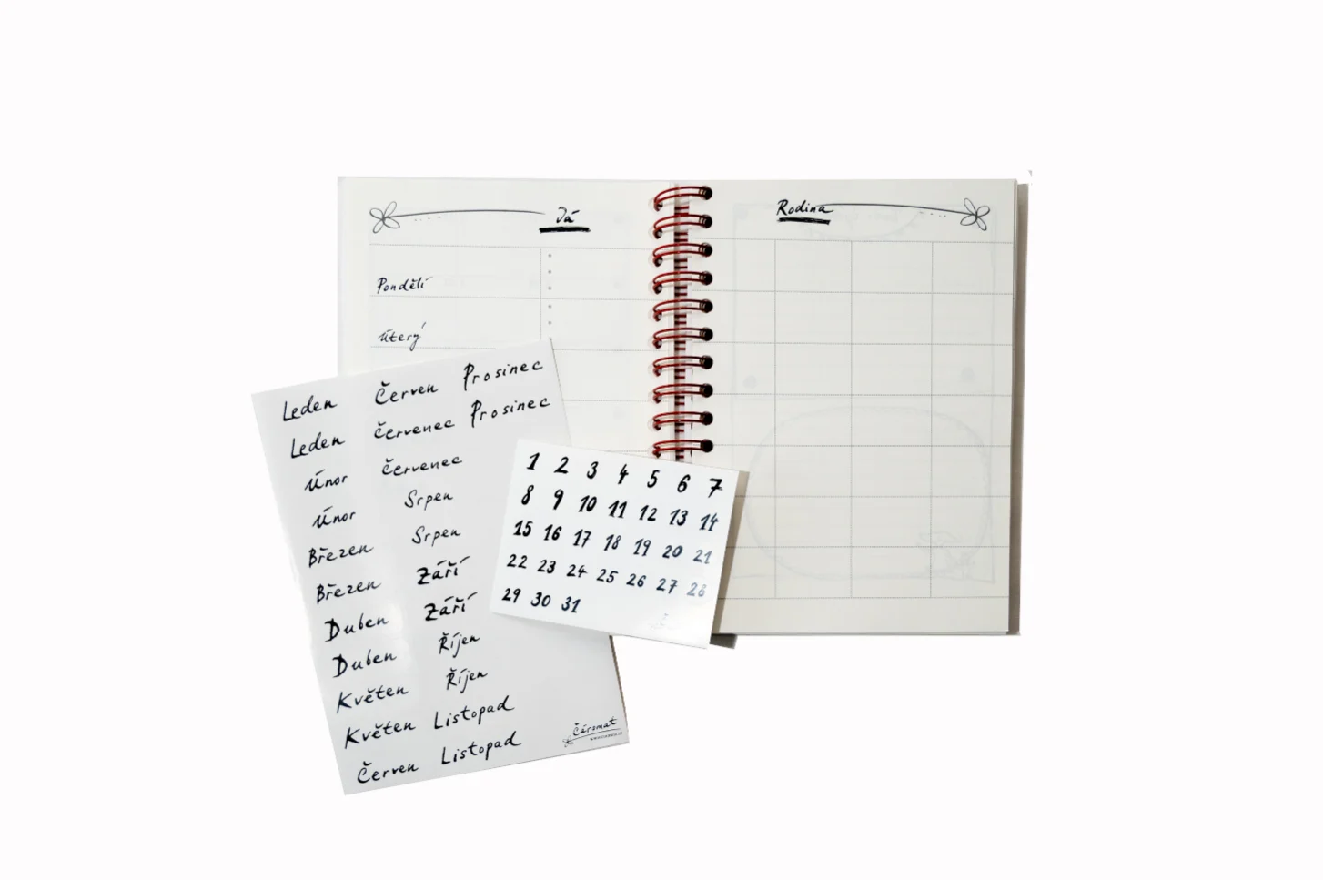 Papírové samolepky s čísly a názvy měsíců.